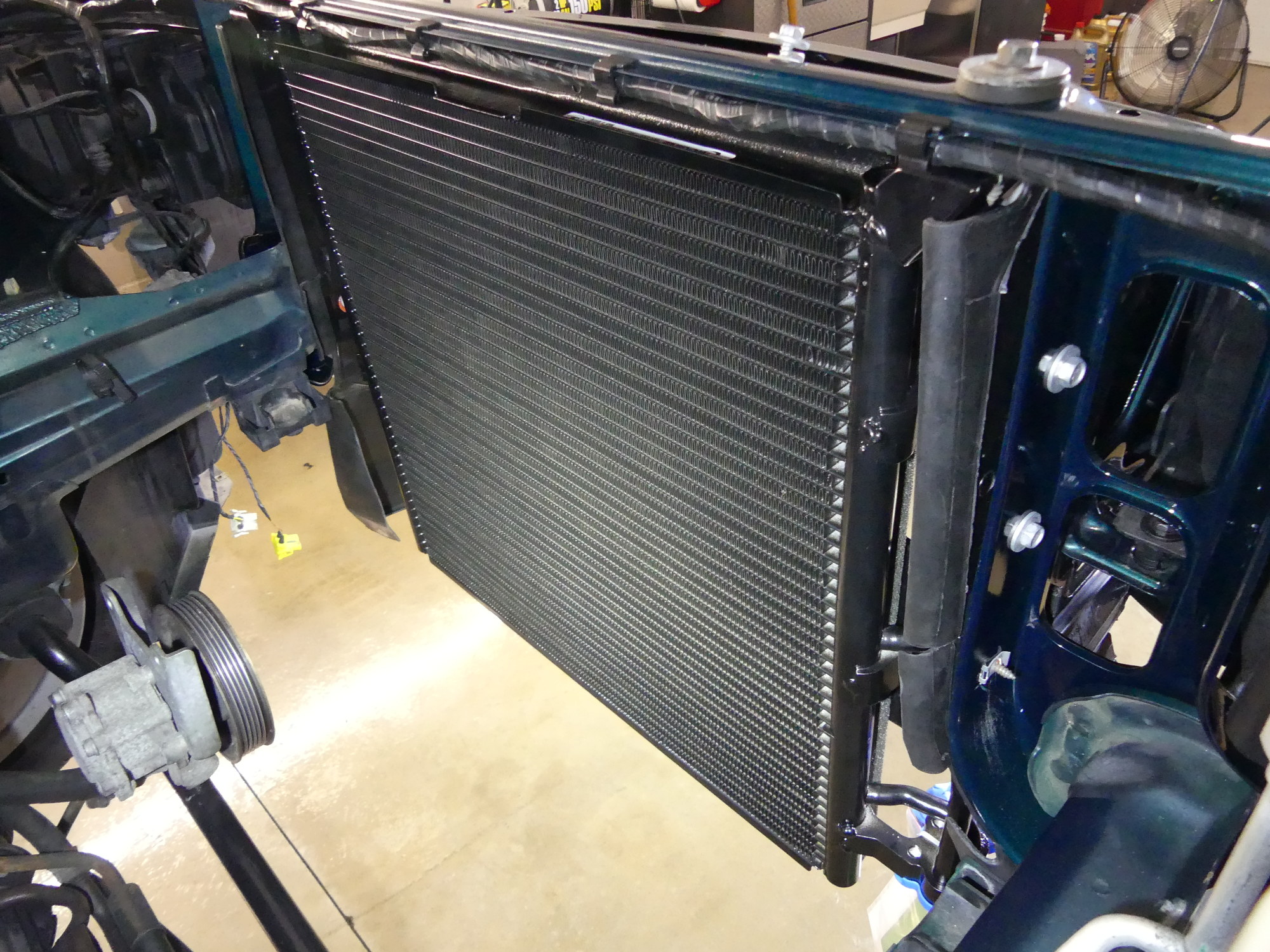 With the headlights installed it was time to install the new condenser and old aux fan. This went pretty much as expected. This was the first time I installed the aux fan with the bumper removed and I have to admit it made accessing three of the four screws a bit easier, though the top left (driver's side) is still a colossal pain in the ass to access and nothing changes in this respect with the bumper off the car. Unfortunately, I did a bit too much damage to that top left screw installing it at an angle so many times. I wondered why the screw was just spinning and not grabbing the new tinnerman clip on the condenser so I pulled it out and realized that the first few threads were completely gone. I was able to secure the aux fan with the remaining screws but I plan to replace them all with new parts before I wrap up the project. That means the pork chops and panel that protects the condenser and radiator will have to remain off the car for now.