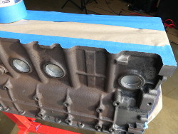 The first topic related to the cleaning of the block. I pointed out that I expected the sides of the block to be free of all original paint and rust and to appear as raw cast iron. When I asked him whether the block was in fact shot blasted as we discussed he said it was. I then suggested that perhaps the problem was they didn't keep it in the machine long enough. His only response was that he didn't typically tell the cleaning company what to do beyond "tank and blast it". So this is the result of two blunders -- first, crappy workmanship by the cleaning company, and lack of ownership or assumption of responsibility on the part of the machinist.