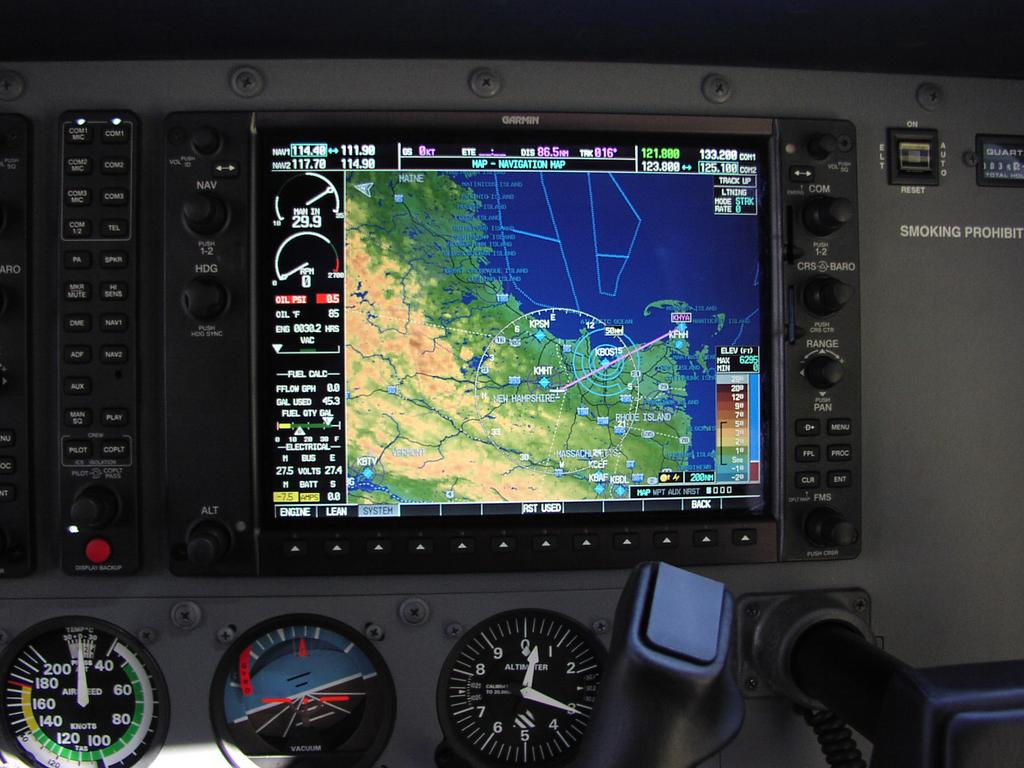 This is the "multi-function display" portion of the Garmin G1000 avionics suite, pictured here in a Cessna 182. This shows our current position (Nashua, NH) with vivid clarity.